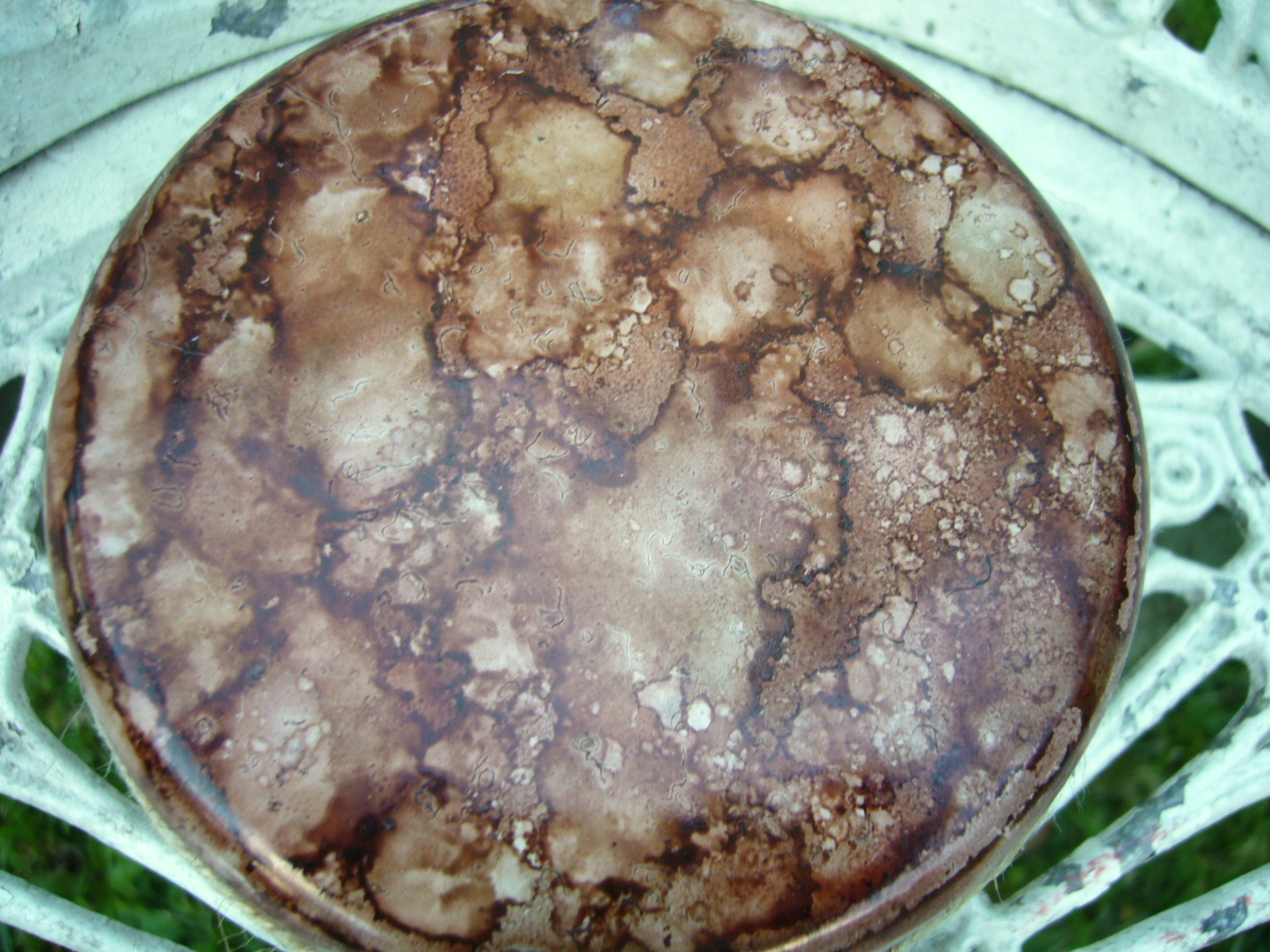 I started by messing around with alcohol inks, Hazelnut, Rust and Ginger I believe it was, dripping and blending them onto the tin until I liked the look. Circular tins, not easy to control where the dribbles are going... fingers - very messy!