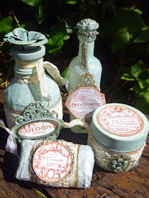 This is quite a stunning collection of perfumerie bottles Alison not forgetting the cute little soap. The soft pastel colour on top of the crackle is quite beautiful as are the altered metal embellishments and vintage stamping. Mo x